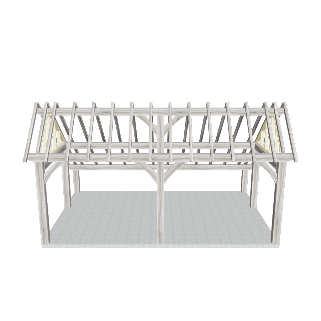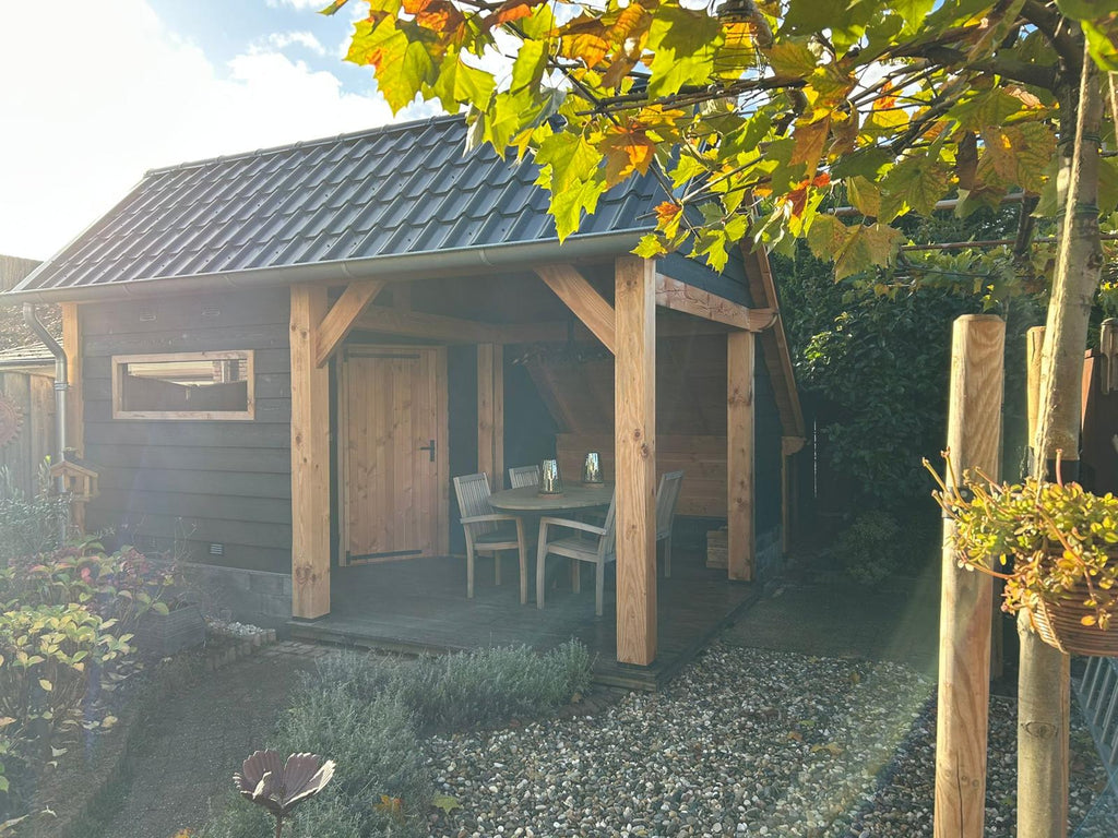 Discover the Sofia, a masterpiece in classic timber construction, available in different sizes from 15.75 to 24 m². This wooden frame, characterized by its characteristic barn roof that is low on one side, combines oversized beams  of 18 x 18 cm and traditional wood joints for a robust and timeless appearance. The Sofia is the ideal solution for those who need a terrace, storage room, workspace or office. With its flexible layout, divided into two parts by support beams, this building effortlessly offers space for two different applications.