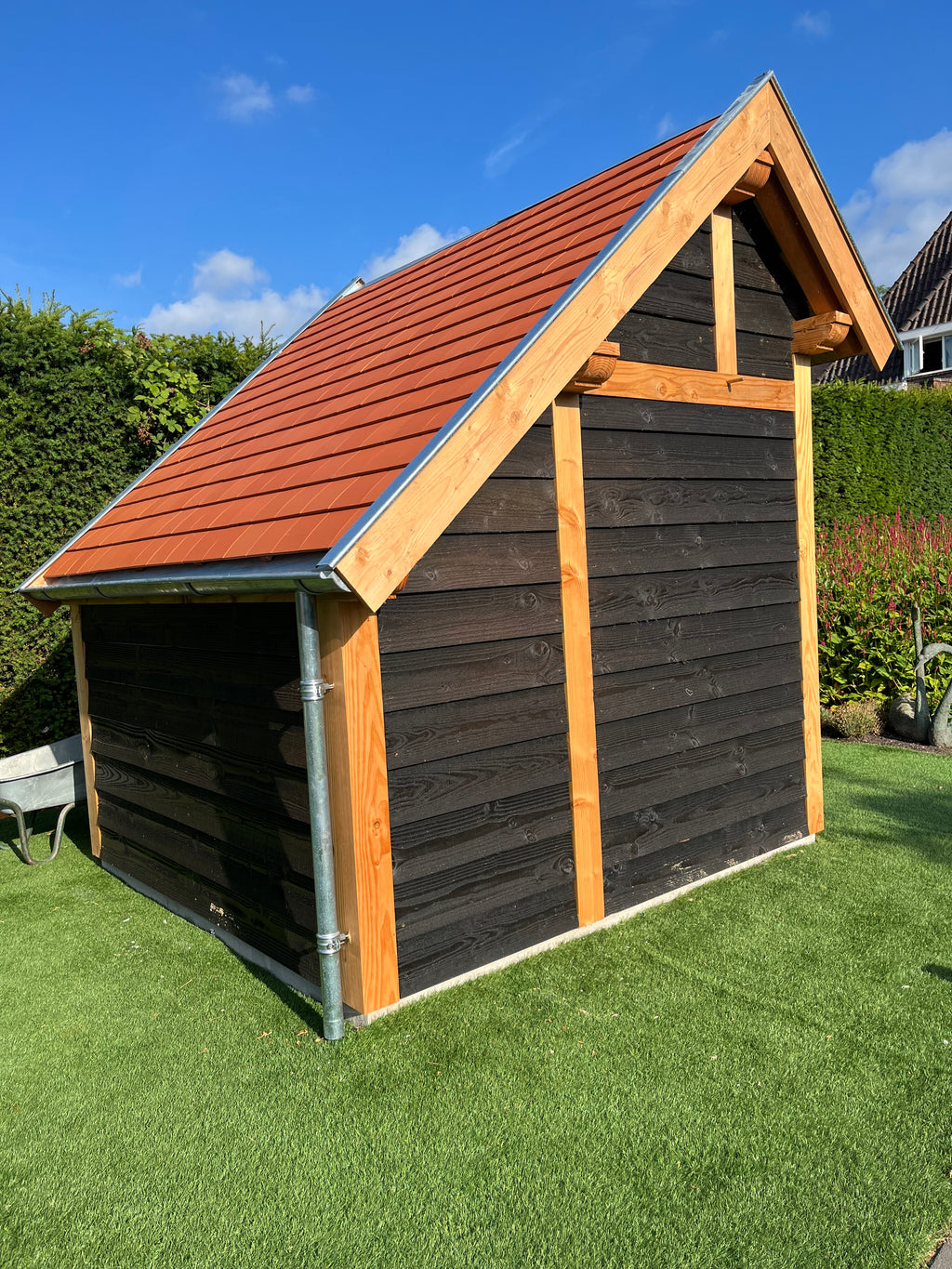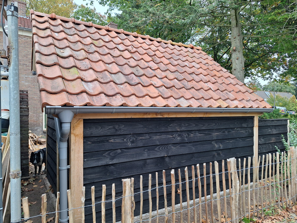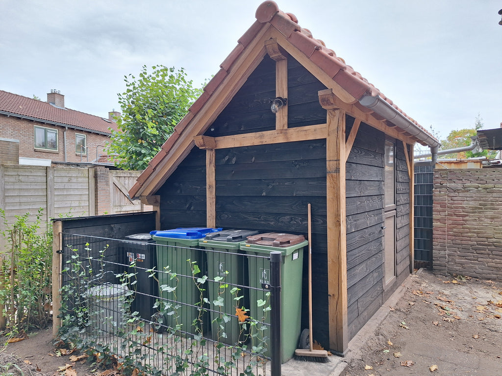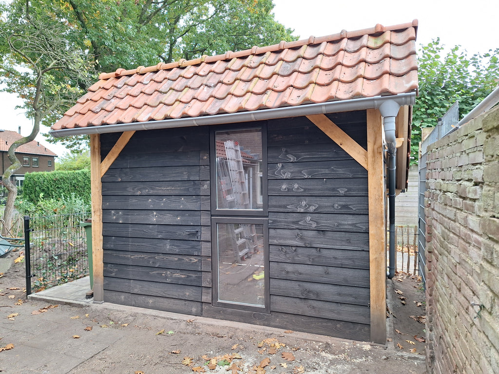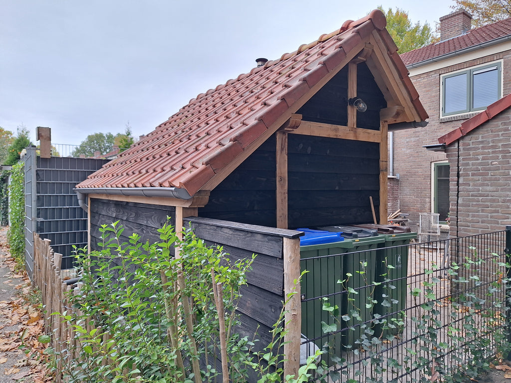 Erg mooie basis voor mijn kapschuurtje. Was met drie man prima in elkaar te zetten binnen een dagdeel. Nu nog het dak erop, tussen de staanders zwart Zweeds rabat en dan kunnen het tuingereedschap en de fietsen erin