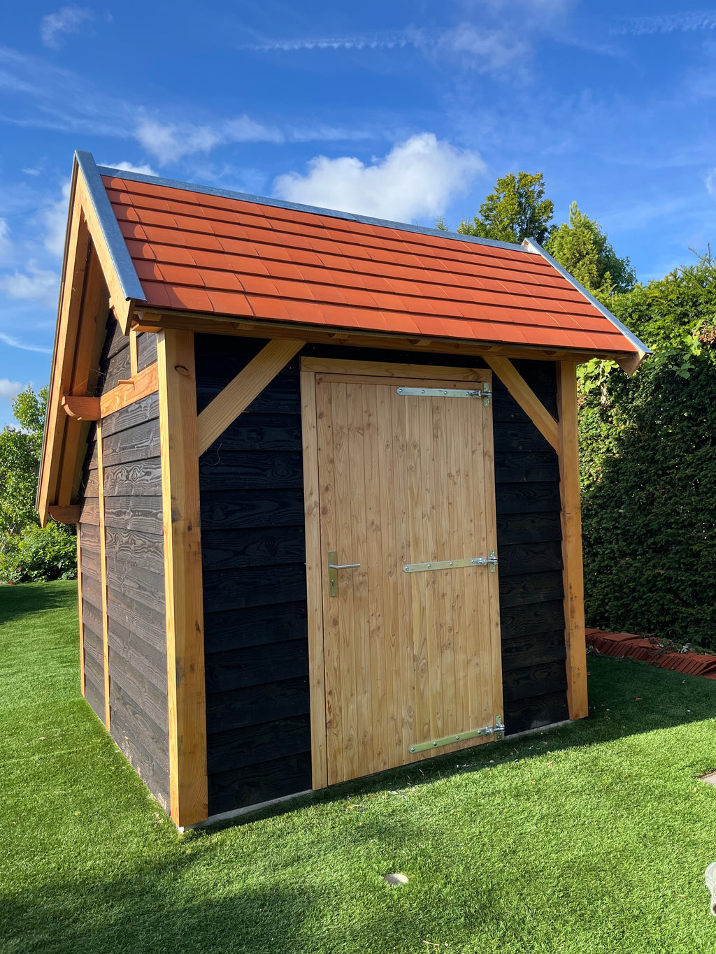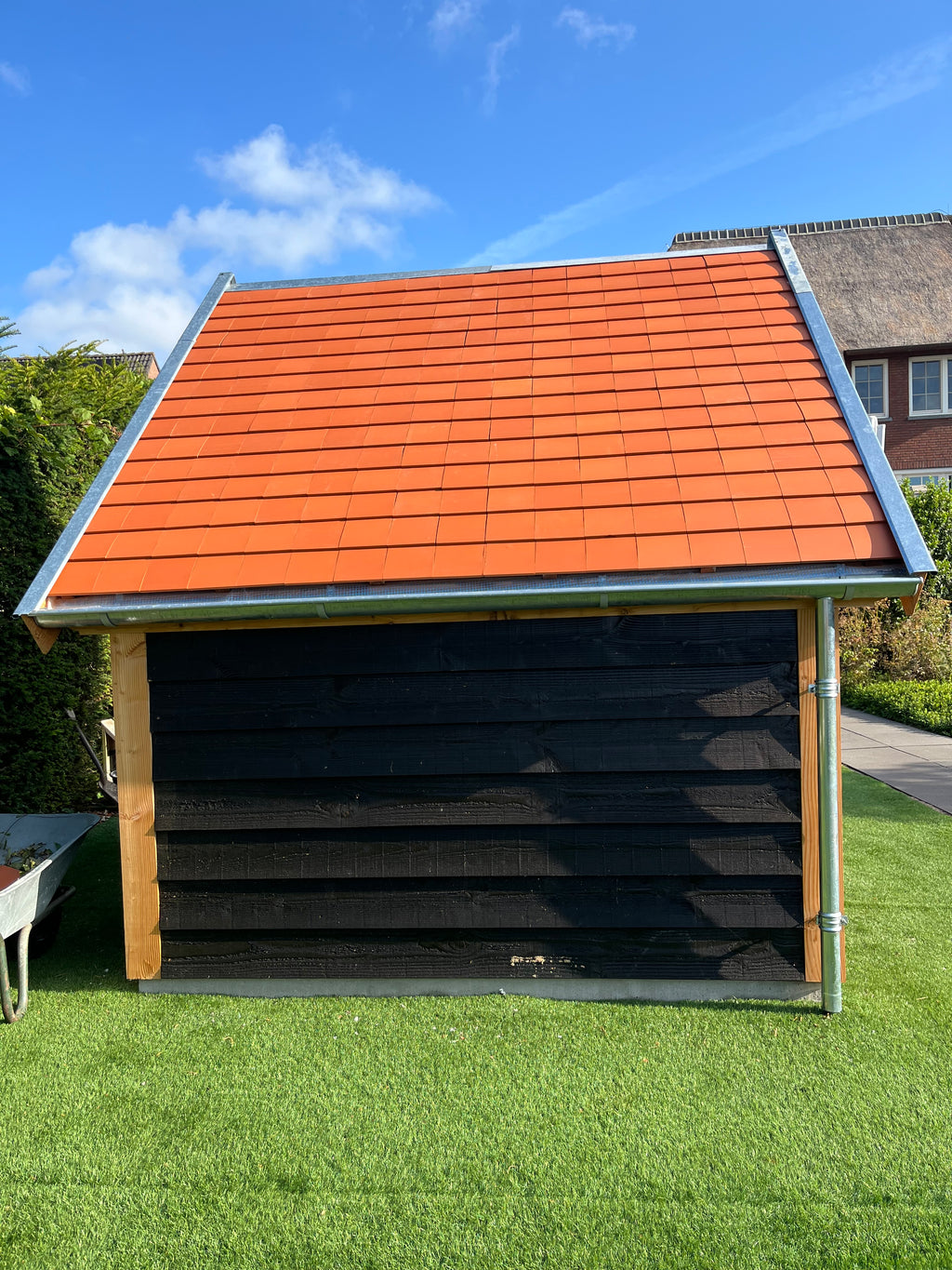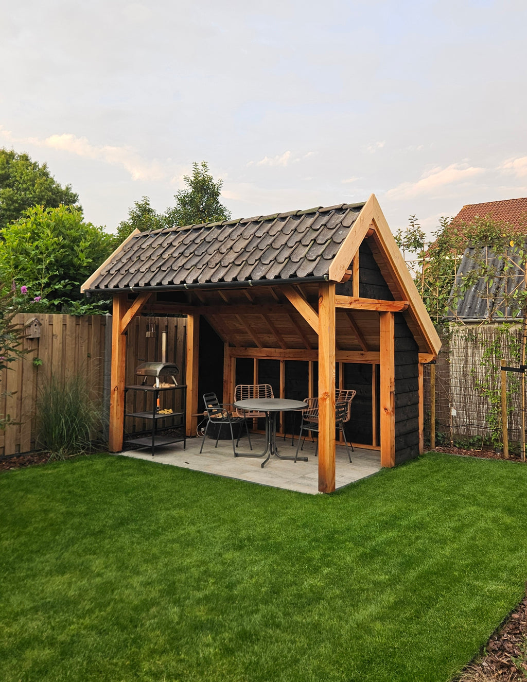 Erg mooie basis voor mijn kapschuurtje. Was met drie man prima in elkaar te zetten binnen een dagdeel. Nu nog het dak erop, tussen de staanders zwart Zweeds rabat en dan kunnen het tuingereedschap en de fietsen erin